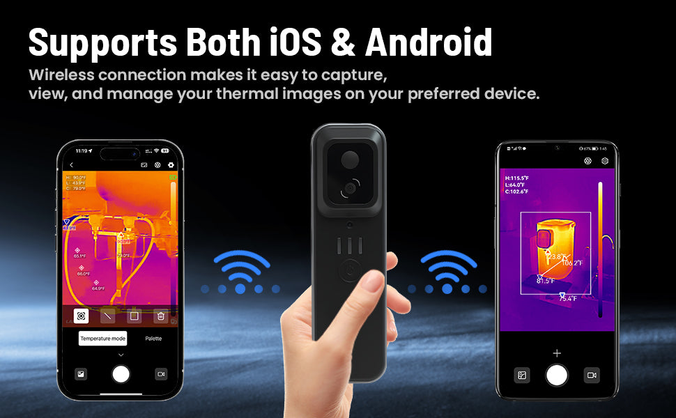 - Wireless & Compatibility: Designed for tight and hard-to-reach spaces, this thermal imaging camera connects wirelessly to both iOS and Android devices via WiFi—no messy cables needed. Whether you're a technician, electrician, or plumber, enjoy ultimate flexibility with three mounting options: clip it onto your smartphone, use it handheld, or mount it on a tripod for stable, hands-free use