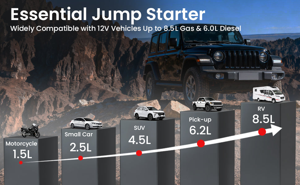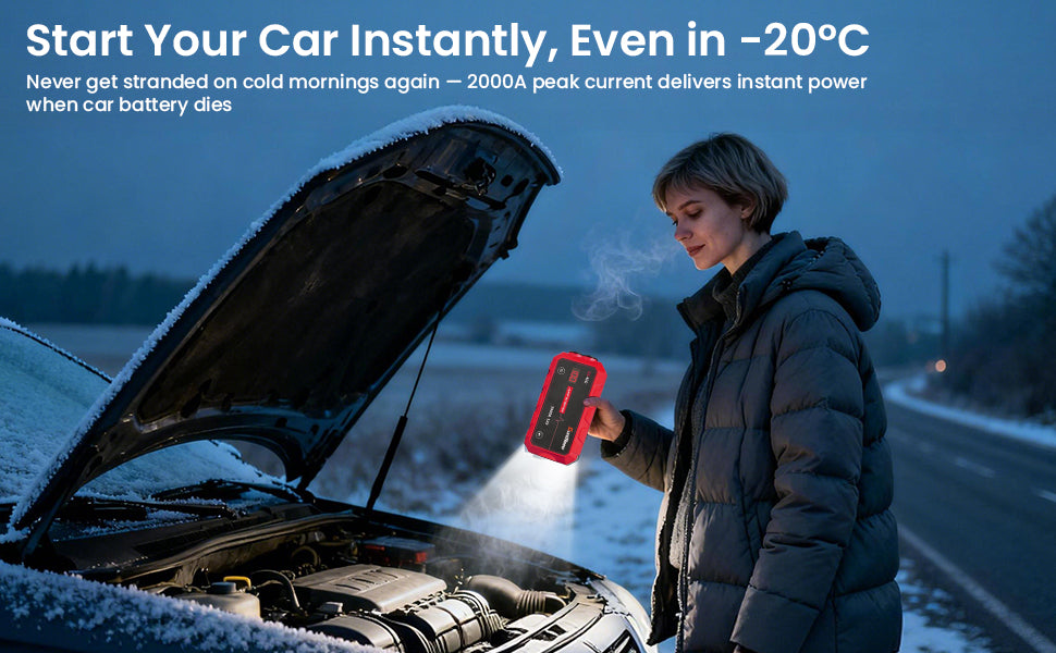 • Powerful 1000A Start & 2000A Peak Output: Equipped with a high-discharge cell pack, this jump starter delivers 1000A for 1 second and 2000A peak (0.1s), enabling reliable starts for most 12V gasoline and diesel vehicles.