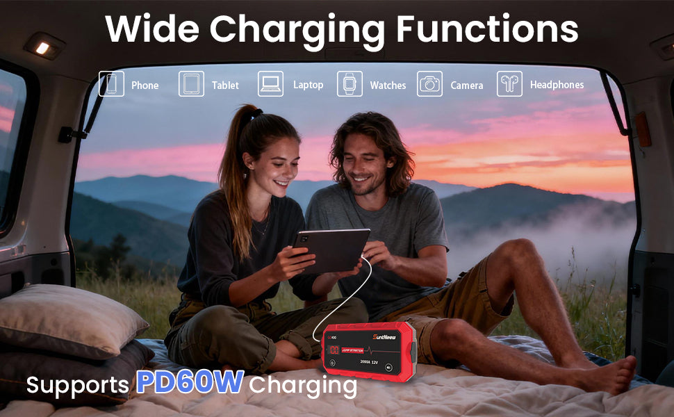 • PD 18W Fast Charging Dual USB Ports: Functions as a high-speed power bank with PD 18W output (5V/3A, 9V/2A, 12V/1.5A). Efficiently charges phones, tablets, dash cams and more. Ideal for roadside assistance and daily carry.