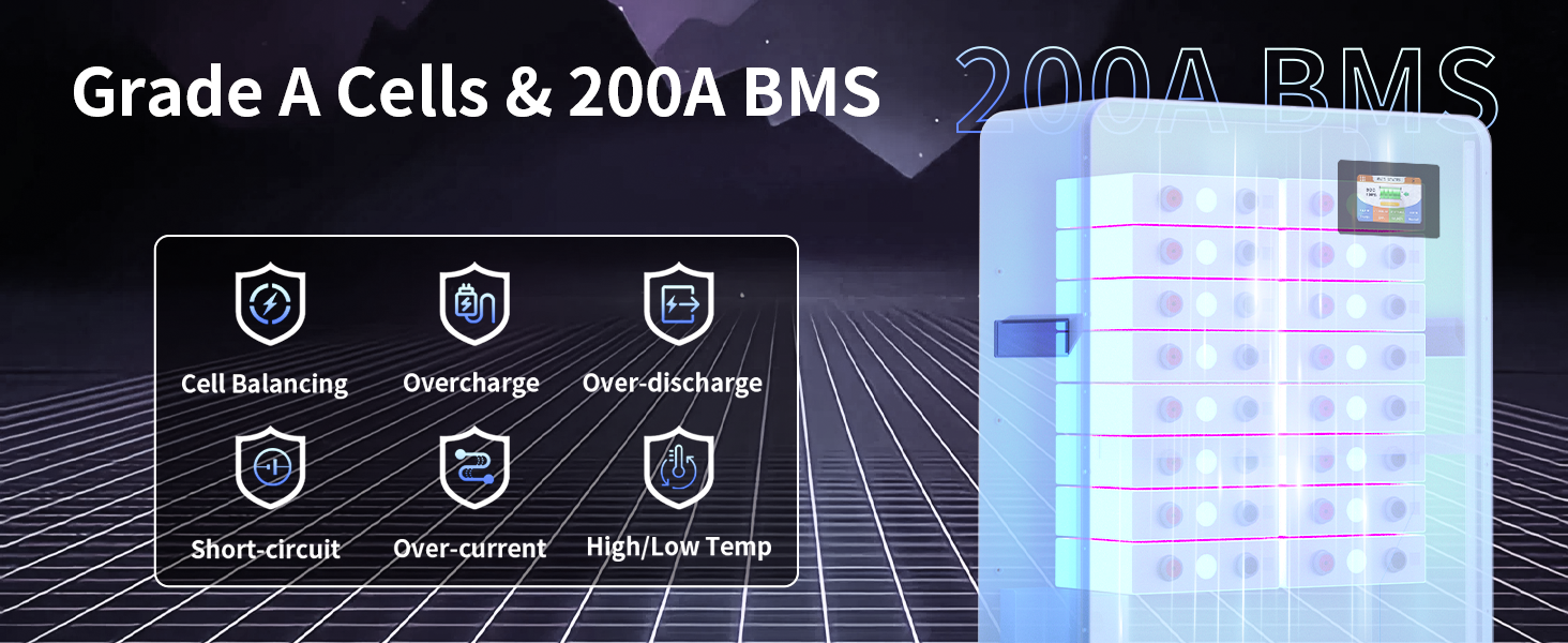 - 【Smart 200A PACE BMS & Low Temp Cutoff】Built-in 200A BMS, our 51.2V 200A battery supports a maximum continuous discharge current of 200A and a load power of up to 10 kW. Advanced BMS also delivers safety and protection, which against overcharging, over-discharging, and short circuits, ensuring the security of your investment and consistent, dependable performance. Additionally, high-temp cutoff halts charging above 167℉(75℃), while low-temp cutoff protects the battery from discharging below -4℉(-20℃).