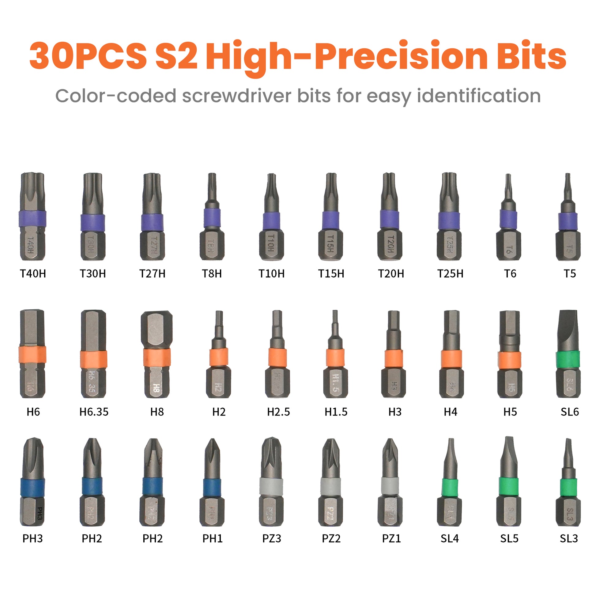 Includes 30 precision bits, 9 sockets, and essential accessories — all clearly labeled for quick selection.