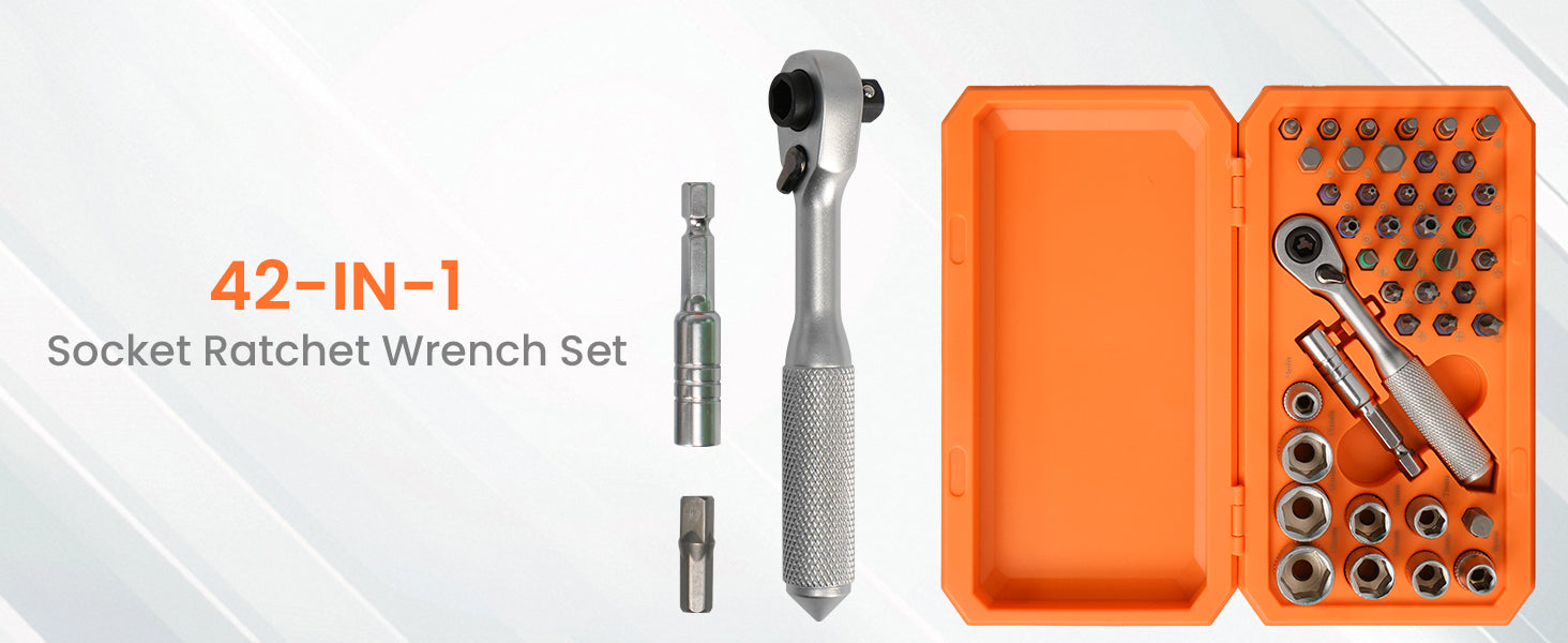 • 42-in-1 All-in-One Toolkit: This multi-purpose ratchet socket set includes 30pcs premium S2 steel bits, 1pcs ratchet wrench, 9pcs six point sockets, 1pcs extension rod, and 1pcs 1/4 adapter. The screwdriver set is finely crafted and wear-resistant
